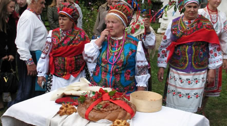 The bridegroom's parents come with a Ukrainian round loaf (homemade,